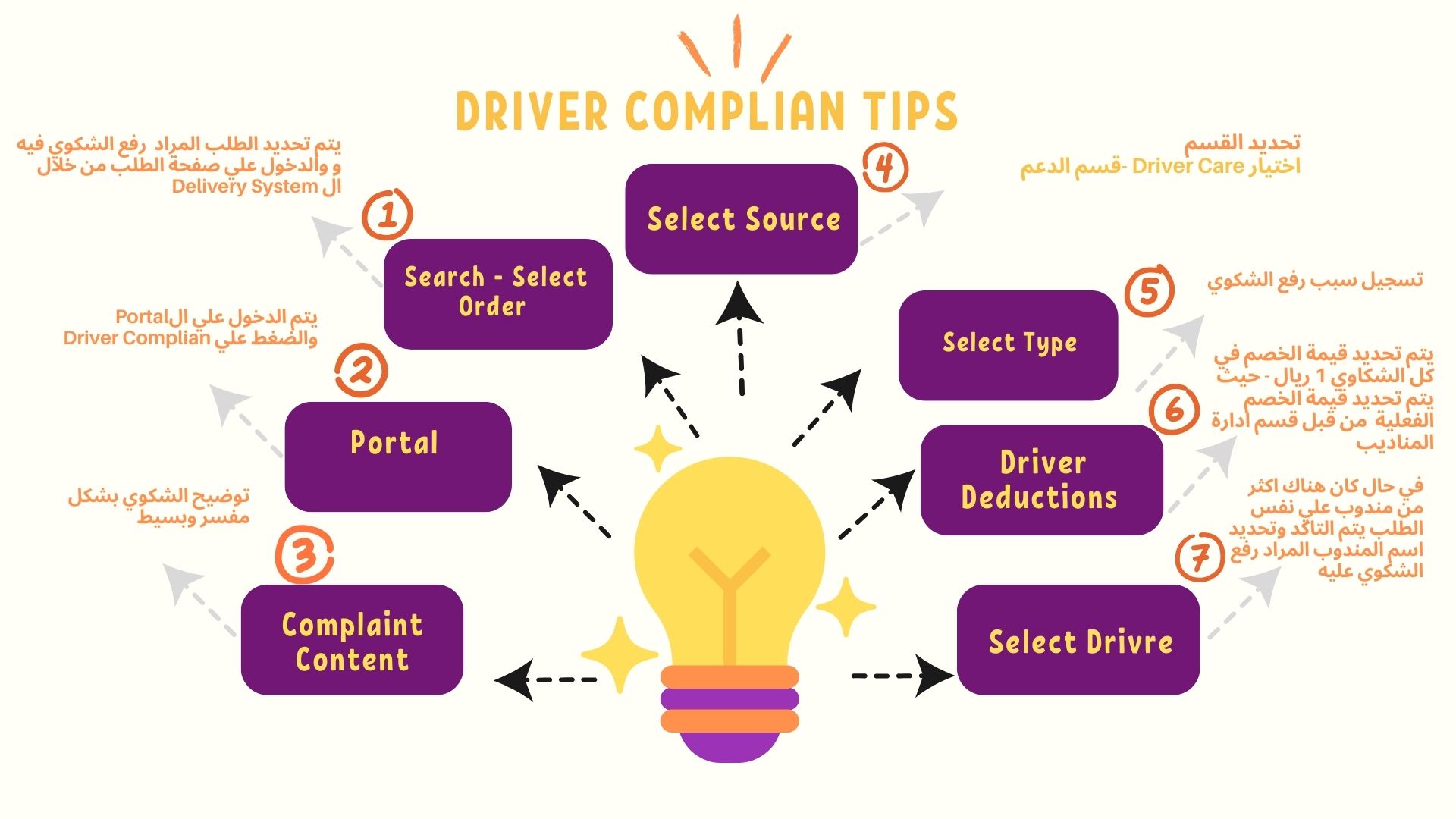 5 - يتم كتابة محتوى الشكوى فى جزء complaint content ثم اختيار مصدر القسم المقدم للشكوى من قائمة source ثم اختيار نوع الشكوى من قائمة Type ثم كتابة قيمة الخصم على المندوب ان وجد فى خانة Driver Deductions ثم رفع الصورة المرفقة مع الشكوى ان وجد من خلال Attach a photo