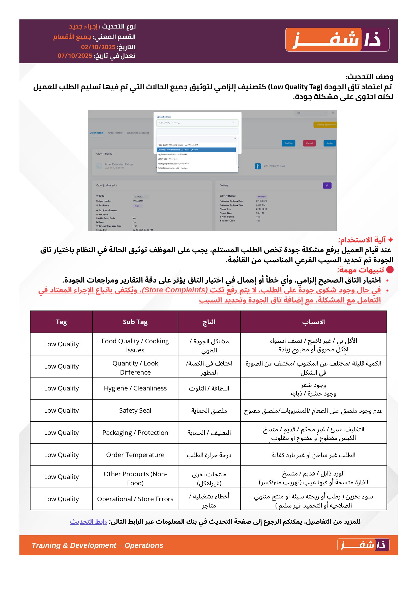 عدم اختيار التاق في مثل هذه الحالات يُعتبر خطأ في الإجراء ويؤثر على دقة التقارير والتحليل ومراجعة الجودة. - في حال وجود شكوى جودة على الطلب، لا يتم رفع تكت (Store Complaints)، ويُكتفى باتباع الإجراء المعتاد في التعامل مع المشكلة، مع إضافة تاق الجودة وتحديد السبب