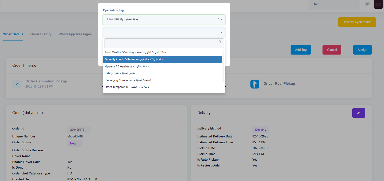 عند وصول أي طلب للعميل وظهور مشكلة مرتبطة بجودة الطلب، يجب على الموظف إلزاميًا اختيار تاق الجودة المناسب من القائمة بالأسفل.